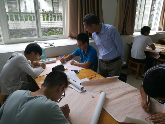 员工们挑灯夜战,汪利民老师和徐慧茹老师到教室指导员工图纸和报告