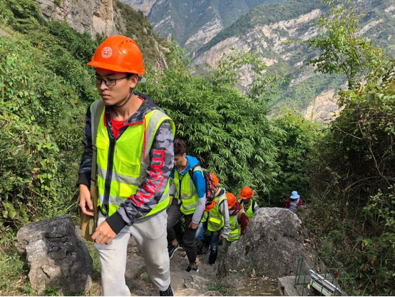 员工攀登高陡的链子崖危岩体并寻找观察点
