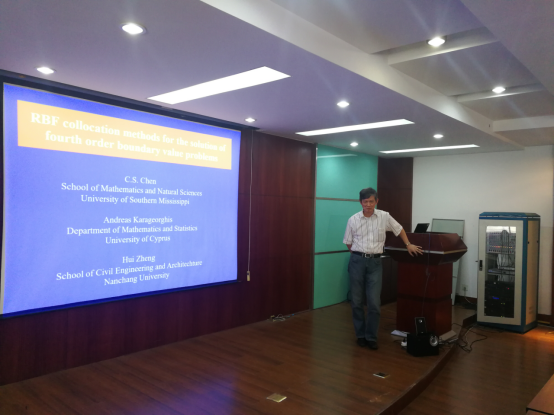 (通讯员 蔡建超)6月24日,受402永利集团熊熊经理和蔡建超教授邀请,美国南密西西比大学(The University of Southern Mississippi)陈清祥教授到402永利集团进行交流,交流期间陈清祥教授做了题为《RBF collocation methods for the solution of fourth order boundary value problems》的学术报告。陈教授详细报告了基于径向基函数映射法求解四阶边值问题,特别考虑了Kansa法和近似特别解MAPSI法。该方法的新颖之处在于包含了位于所考虑问题区域之外的幽灵点。正是这些点的加入提高了该方法的准确度和稳定性。最后对数值例子的误差进行了比较分析,验证了方法的有效性。