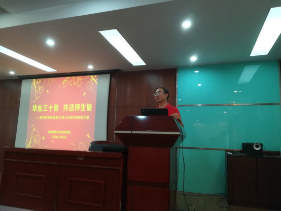 毕业生代表和老教师代表先后发言。毕业员工代表张宗胜站在台上,重新以一个员工谦逊的态度为自己昔日恩师讲述自己30年来的经历,或成就斐然,或略显平凡,但都受到了老师们的一致肯定。老教师潘玉玲表达了注重健康、廉洁奉公、守护家庭、珍惜时光、继续奋进等美好期盼,年近耄耋却依旧心怀国家,心系学子,让人动容。85级原辅导员、现任自动化公司党委书记董浩斌发言。他回顾了当年与员工打成一片的种种往事,感叹岁月之蹉跎,同时也表达了始终不变的物探人情怀让人敬重。
