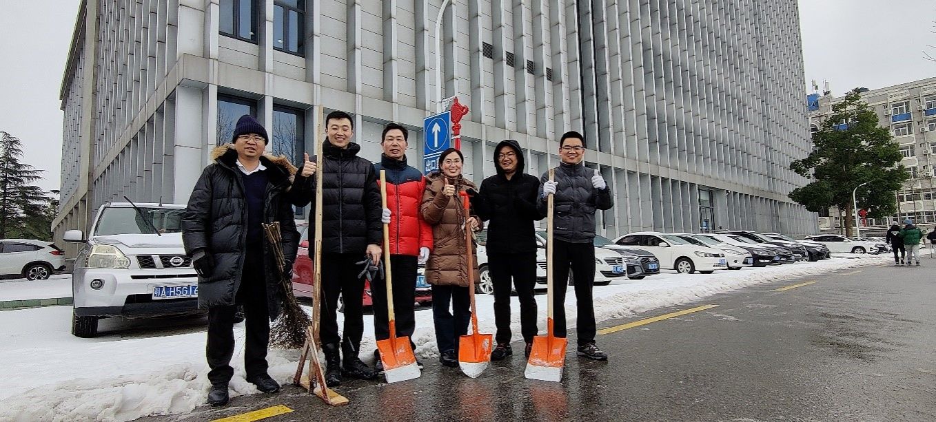 上午8点半,党委书记马彦周、副书记黄金波带领公司教工党员开始清雪除冰工作。分发铁锹、消防镐等工具后,教职工分组进行铲雪、破冰。经过2小时的努力,在物探楼门前广场和基础楼两侧出口各清通2条步行通道。参与教职工党员不畏严寒,全力投入,密切协作,充分发挥了党员模范带头作用,展现了责任担当,用行动守护师生出行安全。